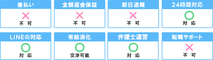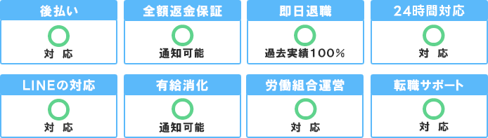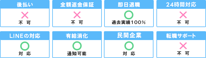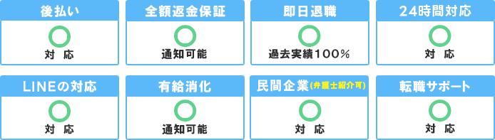 ![]() 即日退職 | ![]() 対応 | ![]() 対応 | ![]() 対応 | ![]() 要相談 |